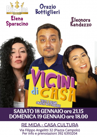 A grande richiesta continua il tour di "Vicini di casa", commedia brillante di Orazio Bottiglieri, che andrà in scena al RE MIDA - CASA CULTURA, via Filippo Angelitti 32 (Piazza Campolo) , SABATO 18 GENNAIO alle ore 21.15 e DOMENICA 19 GENNAIO alle ore 18.00 con la partecipazione di Elena Sparacino ed Eleonora Randazzo.