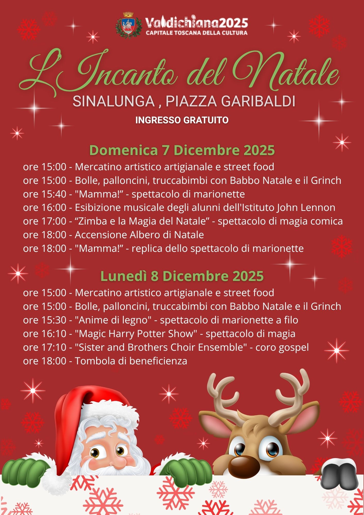 Il Comune di Sinalunga e Valdichiana 2025, Capitale Toscana della Cultura, sono lieti di presentare "L'Incanto del Natale", due giornate dedicate alla magia delle festività in programma domenica 7 e lunedì 8 dicembre 2025 in Piazza Garibaldi.