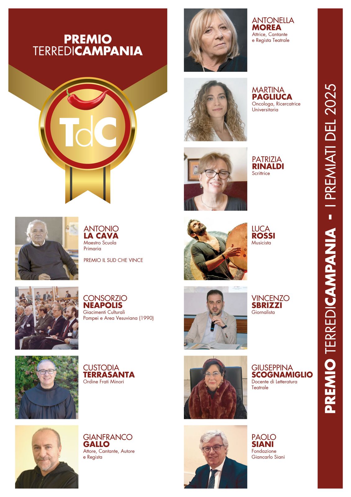 Diversi i settori in cui operano i premiati. L’impegno sociale è rappresentato dalla Custodia di Terra Santa, una fraternità internazionale dell’Ordine dei Frati Minori che custodisce i luoghi della redenzione, tanto martoriati da conflitti lunghissimi, attraverso un dialogo continuo con i popoli e valide azioni di sostegno. La Cultura, primo ed indispensabile strumento di Pace, è rappresentata dal Consorzio Neapolis, antesignano, negli anni 80/90, della valorizzazione e promozione dei giacimenti culturali di Pompei e dell’Area Vesuviana, dalla scrittrice Patrizia Rinaldi, dal maestro Antonio La Cava, che ha ricevuto il Premio IL SUD CHE VINCE per la sua infaticabile opera di diffusione della lettura. Particolare attenzione abbiamo voluto dedicare alla Cultura teatrale e dello spettacolo, nell’anno in cui si è celebrato il centenario di Eduardo Scarpetta, testimone eccellente dell’arte del sorriso. Gianfranco Gallo, Antonella Morea, Luca Rossi sono gli artisti premiati, mentre Giuseppina Scognamiglio, docente di letteratura teatrale, rappresenta l’importanza della trasmissione culturale. La ricerca oncologica, fondamentale per una società più equa, sottolinea la sua importanza con la giovane oncologa e ricercatrice Martina Pagliuca, mentre la legalità, testimoniata, vissuta e raccontata, è protagonista attraverso Vincenzo Sbrizzi, giornalista, e Paolo Siani, testimone di legalità attraverso la Fondazione Siani.